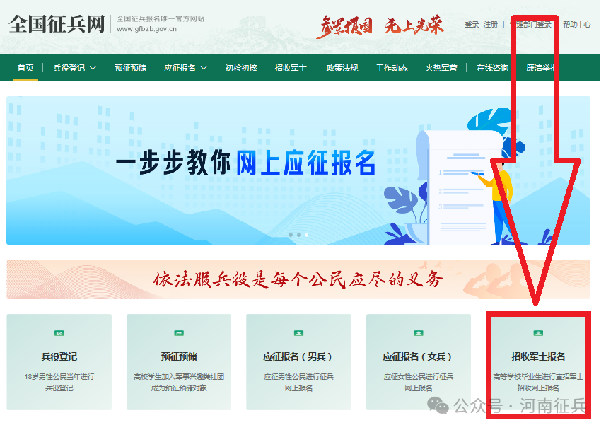 2.登录全国征兵网(https://www.gfbzb.gov.cn/) ,首页点击“招收军士报名”。